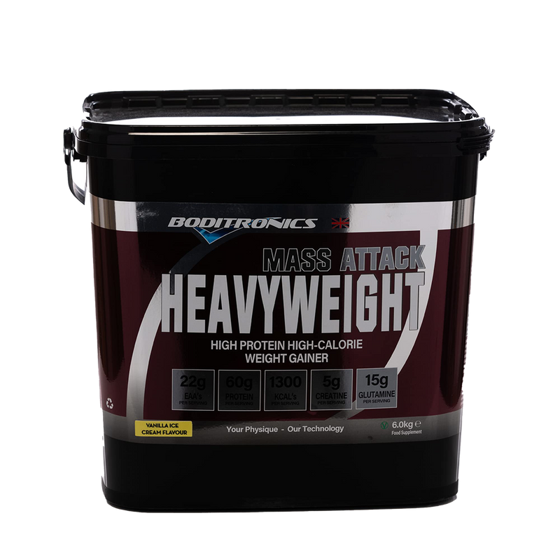 • Boditronics Mass Attack Heavyweight Vanilla 6kg is meticulously formulated for dedicated gym enthusiasts and athletes intent on increasing muscle mass through superior nutrition. Each serving is loaded with 60 grams of protein and an impressive 214 grams of carbohydrates, making it the perfect choice for those who are serious about effective weight gain.